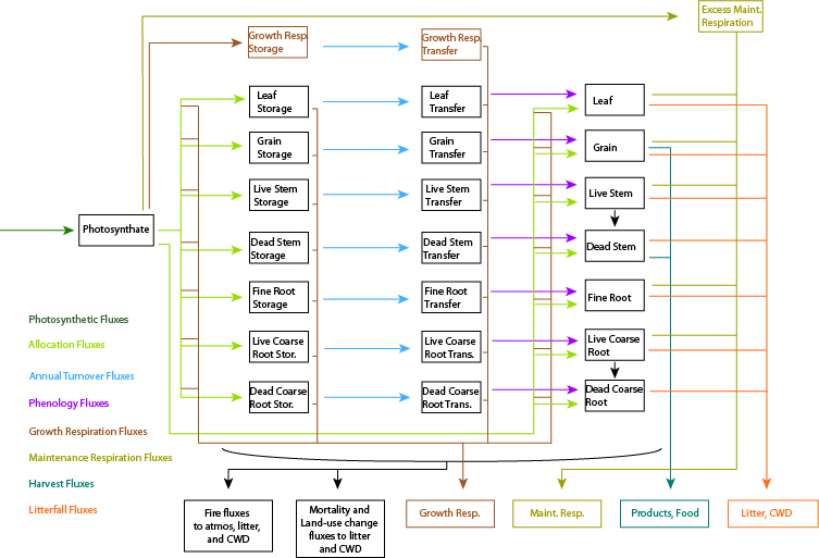 Separate state variables for C and N are tracked for leaf, live stem, dead stem, live coarse root, dead coarse root, fine root, and grain pools (Figure 2.16.1). Each of these pools has two corresponding storage pools representing, respectively, short-term and long-term storage of non-structural carbohydrates and labile nitrogen. There are two additional carbon pools, one for the storage of growth respiration reserves, and another used to meet excess demand for maintenance respiration during periods with low photosynthesis. One additional nitrogen pool tracks retranslocated nitrogen, mobilized from leaf tissue prior to abscission and litterfall. Altogether there are 23 state variables for vegetation carbon, and 22 for vegetation nitrogen.